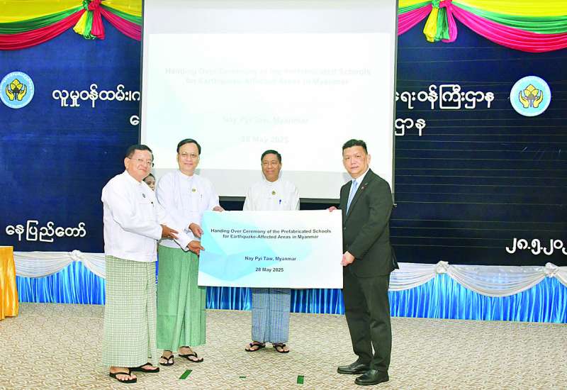 မန္တလေးငလျင်ဘေးသင့်ဒေသများအတွက် AHA Centre မှ တစ်ဆင့် အလှူရှင်နိုင်ငံများက လှူဒါန်းထားသော အသင့်တပ်ဆင်အသုံးပြုနိုင်သည့် ယာယီစာသင်ကျောင်းဆောင်များ (Prefabrica-ted Schools) လွှဲပြောင်းပေးအပ်ခြင်း အခမ်းအနားကို ယနေ့နံနက်ပိုင်းတွင် လူမှုဝန်ထမ်း၊ ကယ်ဆယ်ရေးနှင့်ပြန်လည်နေရာချထားရေးဝန်ကြီးဌာန ဘေးအန္တရာယ်ဆိုင်ရာ စီမံခန့်ခွဲမှုဦးစီးဌာနအစည်းအဝေးခန်းမ၌ ကျင်းပသည်။
