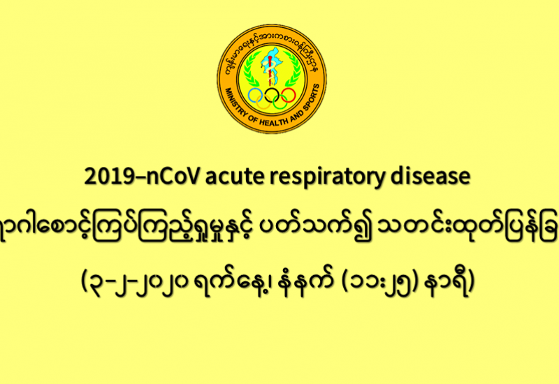 တရုတ်ပြည်သူ့သမ္မတနိုင်ငံ၊ ကွမ်ကျိုး (Guaungzhuo) လေဆိပ်မှ ရန်ကုန်အပြည်ပြည်ဆိုင်ရာလေဆိပ်သို့ (၂၀၂၀) ပြည့်နှစ်၊ ဇန်နဝါရီ (၃၁) ရက်၊ နံနက် (၁၁:၄၅)နာရီ အချိန်ခန့်တွင် ဆိုက်ရောက်လာသည့် China Southern လေကြောင်း ခရီးစဉ်အမှတ် CZ 3055၊ ဖြင့် လိုက်ပါလာသည့် တရုတ်ပြည်သူ့သမ္မတနိုင်ငံသား အမျိုးသားခရီးသည် (၁) ဦးတွင် ကိုယ်ပူချိန်အနည်းငယ်မြင့်မားခြင်း၊ ချောင်းဆိုးခြင်း၊ နှာစေးခြင်းနှင့် လည်ချောင်းနာခြင်း လက္ခဏာများ စစ်ဆေးတွေ့ရှိရသဖြင့် အဆိုပါ ခရီးသည်ကို ဝေဘာဂီ အထူးကုဆေးရုံရှိ သီးခြားခန်း (isolation room) သို့ ပို့ဆောင်ခဲ့ပြီး လုပ်ငန်းလမ်းညွှန်၊ စံလုပ်ထုံးလုပ်နည်းများနှင့် အညီ စောင့်ကြည့်လူနာ (person under in
