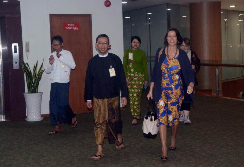 ကုလသမဂ္ဂအတွင်းရေးမှူးချုပ်၏ မြန်မာနိုင်ငံဆိုင်ရာ အထူးကိုယ်စားလှယ်အား  နိုင်ငံခြားရေး ဝန်ကြီးဌာန မဟာဗျူဟာလေ့လာရေးနှင့် လေ့ကျင့်ရေးဦးစီးဌာန ညွှန်ကြားရေးမှူးချုပ် ဦးအောင်မျိုးမြင့် နှင့်တာဝန်ရှိသူများက ရန်ကုန်အပြည်ပြည်ဆိုင်ရာ လေဆိပ်၌ ပို့ဆောင် နှုတ်ဆက်ကြသည်။