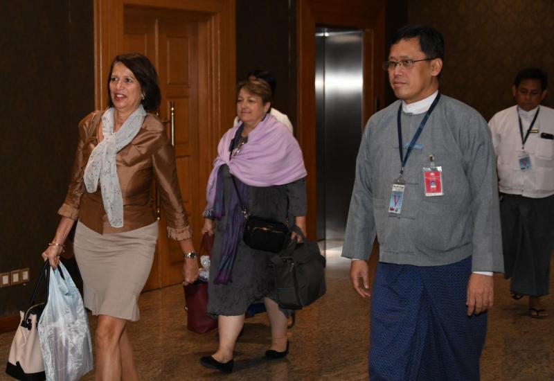 ကုလသမဂ္ဂအတွင်းရေးမှူးချုပ်၏ မြန်မာနိုင်ငံဆိုင်ရာ အထူးကိုယ်စားလှယ်အား နိုင်ငံခြားရေးဝန်ကြီးဌာနမှ တာဝန်ရှိသူများက နေပြည်တော်အပြည်ပြည်ဆိုင်ရာ လေဆိပ်တွင် ကြိုဆိုနှုတ်ဆက်ကြသည်။