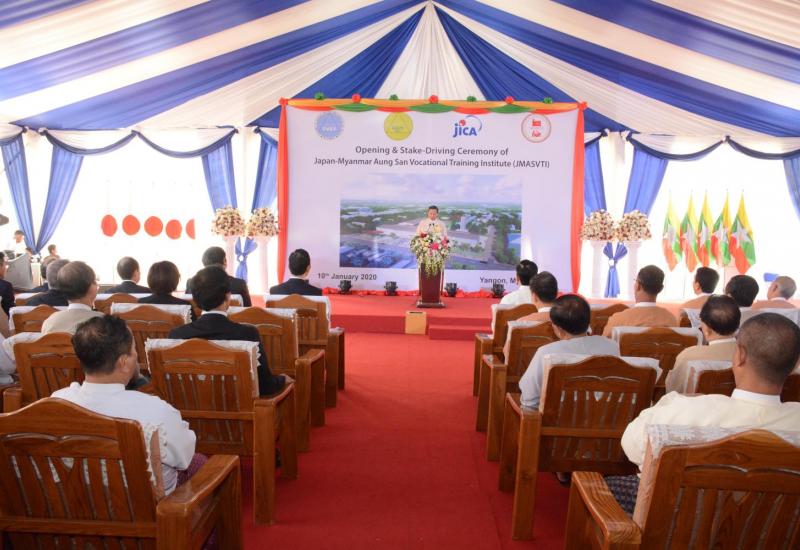 ဂျပန်-မြန်မာ အောင်ဆန်းသက်မွေးပညာသင်တန်းကျောင်း (JMASVTI) ၏ ဖွင့်ပွဲအခမ်းအနားနှင့် ပန္နက်တင်မင်္ဂလာ အခမ်းအနားကို ယနေ့နံနက် ၉ နာရီခွဲတွင် ရန်ကုန်တိုင်း ဒေသကြီး၊ အင်းစိန်မြို့နယ် စဉ့်ငူရပ်ကွက်ရှိ ဂျပန်-မြန်မာ အောင်ဆန်းသက်မွေးပညာ သင်တန်းကျောင်း (JMASVTI) ဆောက်လုပ်မည့် မြေကွက်လပ်ရှိ ယာယီမဏ္ဍပ်တွင် ကျင်းပ သည်။