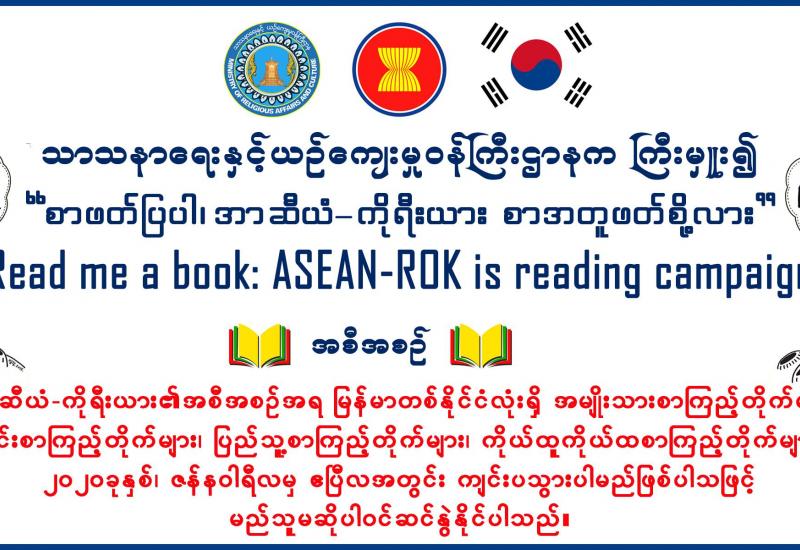 "စာဖတ်ပြပါ၊ အာဆီယံ-ကိုရီးယား စာအတူဖတ်စို့လား" အစီအစဉ်ကို မြန်မာတစ်နိုင်ငံလုံးရှိ တိုင်းဒေသကြီးနှင့် ပြည်နယ်အတွင်း အမျိုးသားစာကြည့်တိုက်များ၊ ကျောင်းစာကြည့်တိုက်များ၊ ပြည်သူ့စာကြည့်တိုက်များ၊ ကိုယ်ထူကိုယ်ထ စာကြည့်တိုက်များတွင် ဇန်နဝါရီ ၁၅ ရက်မှစ၍ ဧပြီလအထိ သာသနာရေးနှင့်ယဉ်ကျေးမှုဝန်ကြီးဌာနက ကြီးမှူးကျင်းပမည် ဖြစ်ကြောင်းသိရသည်။