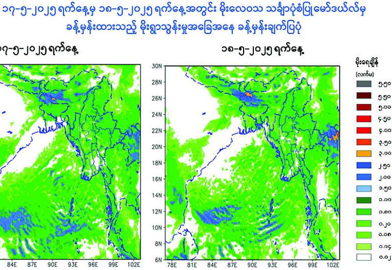 ယနေ့ညနေ ၅ နာရီခွဲအချိန် တိုင်းထွာချက်များအရ ကပ္ပလီပင်လယ်ပြင်နှင့် ဘင်္ဂလားပင်လယ် အော်တောင်ပိုင်းတို့တွင် လေထုမငြိမ်မသက်မှုများ ဖြစ်ပေါ်လာနိုင်ခြင်းကြောင့် လည်းကောင်း၊ မုတ်သုံလေ ဆက်လက်ဝင်ရောက်လာနိုင်ခြင်းကြောင့် လည်းကောင်း၊ အပူပျံတက်တိမ်များ ဖြစ်ထွန်းမှု အားကောင်းခြင်းကြောင့်လည်း ကောင်း မေ ၁၆ ရက်မှ မေ ၂၀ ရက်အတွင်း နေပြည်တော်၊ ရန်ကုန်တိုင်းဒေသကြီး၊ မန္တလေးတိုင်းဒေသကြီး၊ ပဲခူးတိုင်းဒေသကြီး၊ မကွေးတိုင်းဒေသကြီး၊ စစ်ကိုင်းတိုင်းဒေသကြီး၊ ဧရာဝတီတိုင်းဒေသကြီး၊ တနင်္သာရီတိုင်းဒေသကြီး၊ ကချင်ပြည်နယ်၊ ကယားပြည်နယ်၊ ကရင်ပြည်နယ်၊ ချင်းပြည်နယ်၊ မွန်ပြည်နယ်၊ ရခိုင်ပြည်နယ်နှင့် ရှမ်းပြည်နယ်တို့တွင် နေရာစိပ်စိပ်မှ နေရာအနှံ့အပြား မိုးထစ်ချုန်းရွာပြီး ချင်းပြည်နယ်၊ မွန်ပြည်နယ်နှင့် ရှမ်းပြည်နယ်တို့တွင် နေရာကွက်၍ မိုးကြီးမည်။