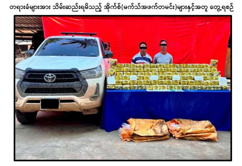 မူးယစ်ဆေးဝါးတားဆီးနှိမ်နင်းရေးရဲတပ်ဖွဲ့မှ တပ်ဖွဲ့ဝင်များပါဝင်သော ပူးပေါင်းအဖွဲ့သည် မေလ ၅ ရက်နေ့ နံနက် ၇ နာရီခွဲအချိန် ရှမ်းပြည်နယ် (အရှေ့ပိုင်း)၊ တာချီလိတ်မြို့၊ ပါဆတ်ရပ်ကွက်တွင် လီလောက်စေးမောင်းနှင်ပြီး လောက်စန်လိုက်ပါလာသည့် TOYOTA REVO ယာဉ်ကို သတင်းအရ ရှာဖွေရာ ယာဉ်ပေါ်မှ ဒေသကာလတန်ဖိုးငွေကျပ် ၁ ဒသမ ၅ ဘီလီယံကျော်တန်ဖိုးရှိ အိုက်စ် (မက်သ်အဖက်တမင်း) ၁၉၈ ကီလို ဖမ်းဆီးရမိခဲ့သဖြင့် ၎င်းတို့အား ဥပဒေအရ အရေးယူထားရှိပြီး ကွင်းဆက်ပြစ်မှုကျူးလွန်သူများအား ဆက်လက်ဖော်ထုတ်လျက်ရှိကြောင်း မြန်မာနိုင်ငံရဲတပ်ဖွဲ့မှ သတင်းရရှိသည်။