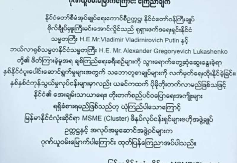 နိုင်ငံတော်စီမံအုပ်ချုပ်ရေးကောင်စီဥက္ကဋ္ဌ နိုင်ငံတော်ဝန်ကြီးချုပ် ဗိုလ်ချုပ်မှူးကြီး မင်းအောင်လှိုင် ဦးဆောင်သော အဆင့်မြင့်ကိုယ်စားလှယ်အဖွဲ့သည် ရုရှားဖက်ဒရေးရှင်းနိုင်ငံ သမ္မတကြီး HE Mr. Vladimir Vladimirovich Putin နှင့် ဘယ်လာရုစ်သမ္မတနိုင်ငံ သမ္မတကြီး HE Mr. Aleksandr Lukashenko တို့၏ ဖိတ်ကြားချက်အရ ၂၀၂၅ ခုနှစ်၊ မတ်လ ၃ ရက်နေ့တွင် သွားရောက်ရာမှ ယနေ့တွင် မြန်မာနိုင်ငံသို့ ပြန်လည်ရောက်ရှိခဲ့ပြီး မြန်မာနိုင်ငံအတွက် အပြုသဘောဆောင်သော ကောင်းမွန်သည့် ရလဒ်များရအောင် ဆွေးနွေးနိုင်ခဲ့သည်။