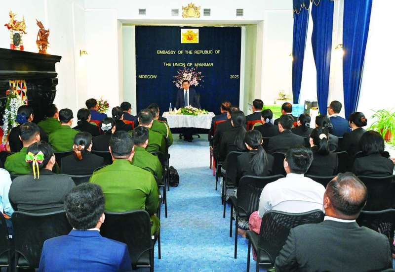 ရုရှားဖက်ဒရေးရှင်းနိုင်ငံ၊ မော်စကိုမြို့တွင် တရားဝင်ချစ်ကြည်ရေးခရီးရောက်ရှိနေသည့် နိုင်ငံတော်စီမံအုပ်ချုပ်ရေးကောင်စီဥက္ကဋ္ဌ နိုင်ငံတော်ဝန်ကြီးချုပ် ဗိုလ်ချုပ်မှူးကြီးမင်းအောင်လှိုင်သည် ရုရှားဖက်ဒရေးရှင်းနိုင်ငံဆိုင်ရာ မြန်မာသံရုံးနှင့် စစ်သံရုံးမိသားစုများအား ဒေသစံတော်ချိန် ယနေ့နံနက်ပိုင်းတွင် ရုရှားဖက်ဒရေးရှင်းနိုင်ငံဆိုင်ရာ မြန်မာသံရုံး၌ တွေ့ဆုံအမှာစကားပြောကြားသည်။
