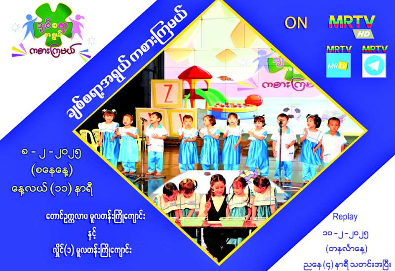 “ချစ်စရာ့အရွယ်ကစားကြမယ်” ကလေးအစီအစဉ်ကို MRTV HD Channelမှ အပတ်စဉ် စနေနေ့တိုင်းထုတ်လွှင့်ပြသလျက်ရှိရာ ဖေဖော်ဝါရီ ၈ ရက် စနေနေ့ မွန်းလွဲ ၁၁ နာရီတွင် ရန်ကုန်မြို့ တောင်ဥက္ကလာပ မူလတန်းကြိုကျောင်းနှင့် လှိုင်(၁)မူလတန်းကြိုကျောင်းတို့မှ ကလေးငယ်များ ပါဝင်ကစားကြပုံများကို မြန်မာ့အသံနှင့်ရုပ်မြင်သံကြား၏ MRTV-HD Channelမှ ဆက်လက်ထုတ်လွှင့်ပြသမည်ဖြစ်သည်။