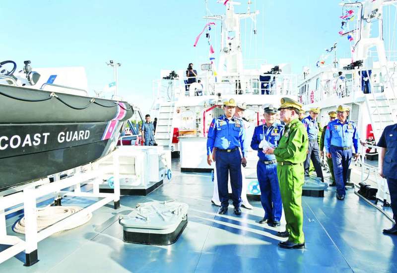 ပြည်ထောင်စုသမ္မတမြန်မာနိုင်ငံတော် ကမ်းခြေစောင့်တပ်ဖွဲ့ကွပ်ကဲမှုဌာနချုပ် တည်ထောင်ခြင်း(၃)နှစ်ပြည့် နှစ်ပတ်လည်နေ့အထိမ်းအမှတ်နှင့် ရေကြောင်းဆိုင်ရာအကျိုးစီးပွားများနှင့် မြန်မာ့ပင်လယ်ကမ်းရိုးတန်းလုံခြုံရေးအား ကာကွယ်စောင့်ရှောက်ရန်အတွက် ၄၈ မီတာ အမြန်သွားကင်းလှည့်ရေယာဉ်(၄)စီး တပ်တော်ဝင်ခြင်းအခမ်းအနားကို ယနေ့မွန်းလွဲပိုင်းတွင် အမှတ်(၃)ရေတပ်ဆိပ်ခံတံတား(သီလဝါ)၌ ကျင်းပပြုလုပ်ရာ နိုင်ငံတော်စီမံအုပ်ချုပ်ရေးကောင်စီဥက္ကဋ္ဌ တပ်မတော်ကာကွယ်ရေးဦးစီးချုပ် ဗိုလ်ချုပ်မှူးကြီးမင်းအောင်လှိုင် တက်ရောက်ဂုဏ်ပြုအမှာစကား ပြောကြားသည်။