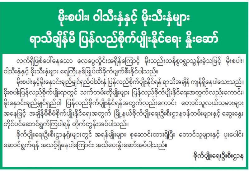 နိုင်ငံတော်အစိုးရအနေဖြင့် ပြည်ပတွင်ရောက်ရှိနေသည့် အမိနိုင်ငံသားများ အခက်အခဲကြုံတွေ့ရပါက နိုင်ငံသားများအပေါ်အလေးအနက် တန်ဖိုးထားသည့်အနေဖြင့် မည်သို့သောအခြေအနေနှင့် တွေ့ကြုံရသည်ဖြစ်စေ မြန်မာကောင်စစ်ဝန်ချုပ်ရုံးနှင့် မြန်မာသံရုံးတို့သည် သက်ဆိုင်ရာသံရုံးများနှင့်ချိတ်ဆက်၍ အမိနိုင်ငံသားများ မြန်မာနိုင်ငံသို့ အမြန်ဆုံး အေးချမ်းလုံခြုံစွာ ပြန်လည်ရောက်ရှိနိုင်ရေး စီစဉ်ဆောင်ရွက်ပေးလျက်ရှိသည်။