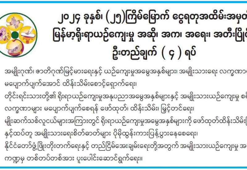 ၁။ ပြည်ထောင်စုသမ္မတမြန်မာနိုင်ငံတော် နိုင်ငံသူ၊ နိုင်ငံသားများအားလုံး ကိုယ်စိတ်နှစ်ဖြာကျန်းမာချမ်းသာပြီး မင်္ဂလာအပေါင်းနှင့် ပြည့်စုံပါစေကြောင်း နှုတ်ခွန်းဆက်သ ဆုမွန်ကောင်းတောင်းလိုက်ပါသည်။