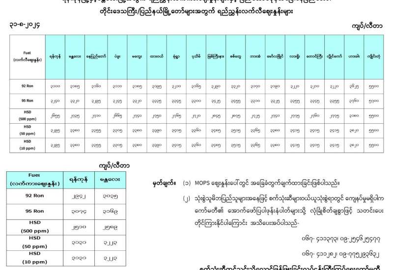 ရန်ကုန်မြို့နှင့် မန္တလေးမြို့အတွက် ရည်ညွှန်းလက်ကားဈေးနှုန်းများနှင့် ပြည်ထောင်စုနယ်မြေ နေပြည်တော်၊ တိုင်းဒေသကြီး/ပြည်နယ် မြို့တော်များအတွက် ရည်ညွှန်းလက်လီဈေးနှုန်းများ