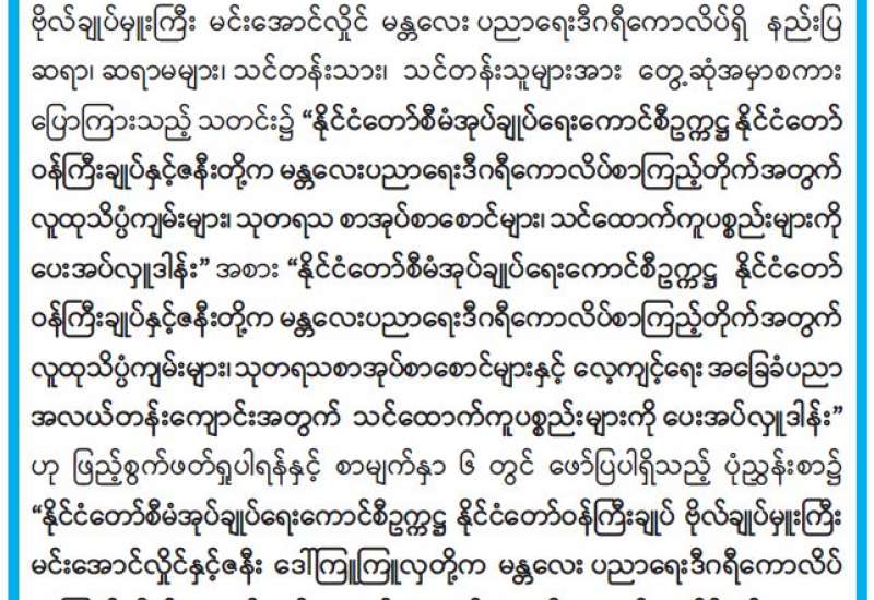 ရင်းနှီးမြှုပ်နှံမှုနှင့် နိုင်ငံခြားစီးပွားဆက်သွယ်ရေးဝန်ကြီးဌာန ပြည်ထောင်စုဝန်ကြီး ဒေါက်တာကံဇော်သည် ယနေ့ညနေပိုင်းတွင် နေပြည်တော်ရှိ Horizon Lake View ဟိုတယ်၌ ကျင်းပသည့် မြန်မာနိုင်ငံနှင့် တရုတ်ပြည်သူ့သမ္မတနိုင်ငံတို့အကြား လူ့စွမ်းအားအရင်းအမြစ်ဖွံ့ဖြိုးတိုးတက်စေရေး တရုတ်ပြည်သူ့သမ္မတနိုင်ငံ စီးပွားရေးနှင့်ကူးသန်းရောင်းဝယ်ရေးဝန်ကြီးဌာန (Ministry of Commerce- MOFCOM) ပညာ တော်သင်ဆုပေးအပ်ပွဲအခမ်းအနားသို့ တက်ရောက်အမှာစကား ပြောကြားသည်။