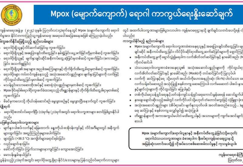 ကျန်းမာရေးဝန်ကြီးဌာနသည် ကိုဗစ်-၁၉ ရောဂါ စောင့်ကြပ်ကြည့်ရှုခြင်းလုပ်ငန်းများကို စဉ်ဆက်မပြတ် ဆောင်ရွက်လျက်ရှိရာ (၁၈-၈-၂၀၂၄)ရက်နေ့၊ ည(၈:၀၀)နာရီမှ (၂၅-၈-၂၀၂၄)ရက်နေ့၊ ည(၈:၀၀)နာရီအထိ ရက်သတ္တပတ်အတွင်း ဓာတ်ခွဲနမူနာစုစုပေါင်း (၂၁,၇၆၂)ခုအား စစ်ဆေးပြီးစီးခဲ့ရာ COVID-19 ရောဂါ ဓာတ်ခွဲအတည်ပြုလူနာသစ်(၃၈)ဦး တွေ့ရှိရပါသည်။ ထို့ကြောင့် ရောဂါပိုးတွေ့ရှိမှုရာခိုင်နှုန်းမှာ (၀.၁၇) ရာခိုင်နှုန်းဖြစ်ပါသည်။ အစီရင်ခံကာလအတွင်း COVID-19 ရောဂါဖြင့် သေဆုံးသူမရှိပါ။