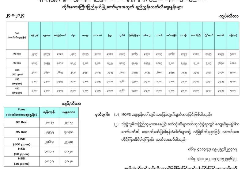 စက်သုံးဆီ တင်သွင်းသိုလှောင်ဖြန့်ဖြူးခြင်း လုပ်ငန်းကြီးကြပ်ရေးကော်မတီသည် ပြည်တွင်းစက်သုံးဆီလက်ကျန်အခြေအနေအရ ဖူလုံစွာဖြန့်ဖြူးနိုင်ရန်အတွက် ပြည်ပမှ စက်သုံးဆီတင်သင်္ဘောများအား Shipment Plan အစီအစဉ်အတိုင်း အဆက်မပြတ်ဝင်ရောက်နိုင်ရန်အတွက် စီမံဆောင်ရွက်လျက်ရှိရာ ဩဂုတ် ၂၂ ရက်တွင် ရန်ကုန်မြစ်ဝ Pilot ၌ ဆီတင်သင်္ဘောခြောက်စင်းရောက်ရှိ အသင့်စောင့်ဆိုင်းလျက်ရှိပြီး သီလဝါဆိပ်ကမ်းဒေသရှိ Jetty များတွင်လည်း သင်္ဘောလေးစင်းရောက်ရှိ ဆိုက်ကပ်၍ ဒီဇယ်ဆီ တန် ၇၀၀၀၀ ကျော်နှင့် ဓာတ်ဆီတန် ၁၁၀၀၀ ကျော်အား သိုလှောင်ကန်များတွင် ချယူဖြည့်တင်းလျက်ရှိသည့်အပြင် ထပ်မံဝင်ရောက်လာမည့်ဆီတင်သင်္ဘောများလည်း အစီအစဉ်တိုင်း ဝင်ရောက်နိုင်ရန် စီစဉ်ဆောင်ရွက်လျက်ရှိပြီး တိုင်းဒေသကြီး/ ပြည်နယ်များသို့ ပို့ဆောင် မည့် ဆီတင်ယာဉ် Bowser များ အချိန်မီထွက်ခွာနိုင်ရေး၊ သီလဝါ သိုလှောင်ကန်စခန်းများရှိ ဆီဖြည့်တင်းပေးမှုများ အဆင်ပြေချောမွေ့ စေရေးတို့ကိုလည်း ကြီးကြပ်ဆောင်ရွက်လျက်ရှိသည်။