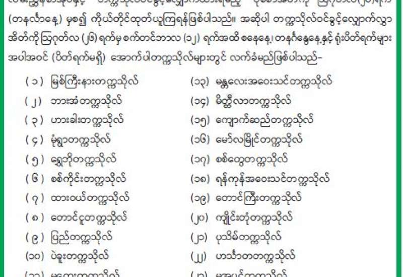 ၂၀၂၄ ခုနှစ် တက္ကသိုလ်ဝင်စာမေးပွဲအောင်မြင်သူများသည် တက္ကသိုလ်ဝင်ခွင့်လျှောက်ထားနိုင်ရန်အတွက် မိမိတို့စာမေးပွဲဖြေဆိုခဲ့သော စာစစ်ဌာနကြီးကြပ်ရေးမှူးများ (အခြေခံပညာအထက်တန်းကျောင်းအုပ်ကြီးများ)ထံတွင် အမှတ်စာရင်း၊ အရည်အချင်းမှတ်တမ်းချုပ်ရမှတ်အဆင့်၊ တက္ကသိုလ်ဝင်ခွင့်လမ်းညွှန်စာအုပ်နှင့် တက္ကသိုလ်ဝင်ခွင့်လျှောက်ထားရမည့် ပုံစံစာအိတ်ကို ဩဂုတ်လ(၂၆)ရက် (တနင်္လာနေ့) မှစ၍ ကိုယ်တိုင်ထုတ်ယူကြရန်ဖြစ်ပါသည်။ အဆိုပါ တက္ကသိုလ်ဝင်ခွင့်လျှောက်လွှာအိတ်ကို ဩဂုတ်လ (၂၆) ရက်မှ စက်တင်ဘာလ (၁၂) ရက်အထိ စနေနေ့၊ တနင်္ဂနွေနေ့နှင့် ရုံးပိတ်ရက်များ အပါအဝင် (ပိတ်ရက်မရှိ) အောက်ပါတက္ကသိုလ်များတွင် လက်ခံမည်ဖြစ်ပါသည်-