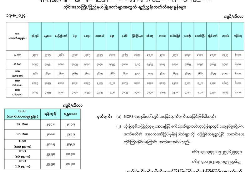 ရန်ကုန်မြို့နှင့် မန္တလေးမြို့အတွက် ရည်ညွှန်းလက်ကားဈေးနှုန်းများနှင့် ပြည်ထောင်စုနယ်မြေ နေပြည်တော်၊ တိုင်းဒေသကြီး/ပြည်နယ် မြို့တော်များအတွက် ရည်ညွှန်းလက်လီဈေးနှုန်းများ