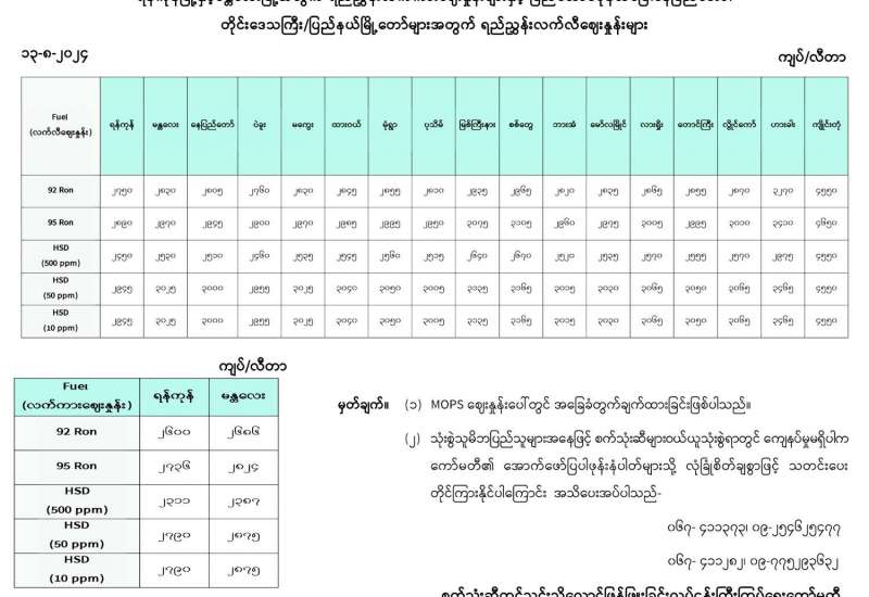 ရန်ကုန်မြို့နှင့် မန္တလေးမြို့အတွက် ရည်ညွှန်းလက်ကားဈေးနှုန်းများနှင့် ပြည်ထောင်စုနယ်မြေ နေပြည်တော်၊ တိုင်းဒေသကြီး/ပြည်နယ် မြို့တော်များအတွက် ရည်ညွှန်းလက်လီဈေးနှုန်းများ