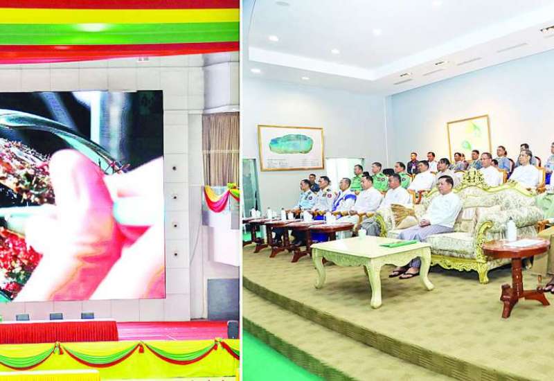 (၁၄၂)ကြိမ်မြောက် မြန်မာ့တောင်ပင်လယ်ပုလဲရောင်းချပွဲ ဖွင့်ပွဲအခမ်းအနားကို ယနေ့နံနက်ပိုင်းတွင် နေပြည်တော်ရှိ မဏိရတနာကျောက်စိမ်းခန်းမ၌ ကျင်းပရာ နိုင်ငံတော်စီမံအုပ်ချုပ်ရေးကောင်စီဥက္ကဋ္ဌ နိုင်ငံတော်ဝန်ကြီးချုပ် ဗိုလ်ချုပ်မှူးကြီး မင်းအောင်လှိုင် တက်ရောက်ချီးမြှင့်သည်။