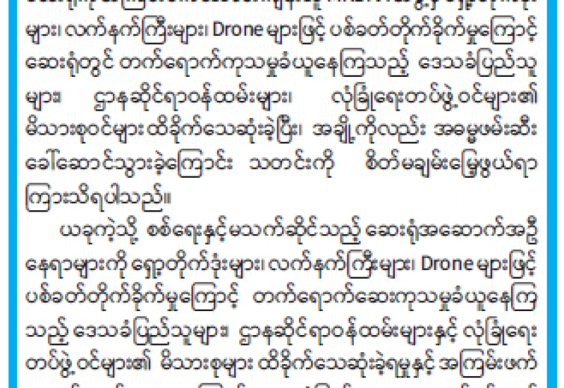 MNDAA အကြမ်းဖက်သောင်းကျန်းသူအဖွဲ့အနေဖြင့် ရှမ်းပြည်နယ် (မြောက်ပိုင်း)၊ လားရှိုးမြို့အတွင်း တိုက်ပွဲများဖော်ဆောင်ပြီး စစ်ရေးနှင့်သက်ဆိုင်ခြင်းမရှိသည့် တပ်မတော်ဆေးရုံအား ရှော့တိုက်ဒုံးများ၊ လက်နက်ကြီးများနှင့် Drone များဖြင့် ပစ်ခတ်တိုက်ခိုက်မှုကြောင့် ဆေးရုံတွင်တက်ရောက်ကုသမှုခံယူနေကြသည့် ဒေသခံပြည်သူများ၊ ဌာနဆိုင်ရာဝန်ထမ်းများနှင့် လုံခြုံရေးတပ်ဖွဲ့ဝင်များ၏ မိသားစုဝင်များ ထိခိုက်သေဆုံးခဲ့ရပြီး အချို့ကိုလည်း အဓမ္မဖမ်းဆီးခေါ်ဆောင်သွားကြောင်း သိရှိရသည်။