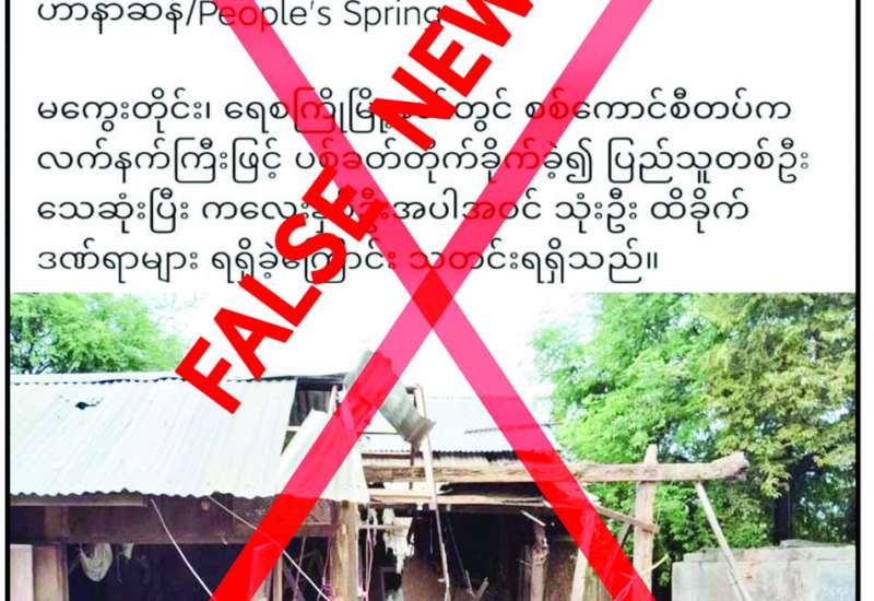 မကွေးတိုင်းဒေသကြီး၊ ရေစကြိုမြို့နယ်၊ အလယ်ကျောကျေးရွာနှင့် ကိုရင့်ကျေးရွာတို့ကို တပ်မတော်က လက်နက်ကြီးဖြင့် ပစ်ခတ်တိုက်ခိုက်မှုကြောင့် ပြည်သူ ၁ ဦး သေဆုံးပြီး ကလေးနှစ်ဦး အပါအဝင် ၃ ဦးဒဏ်ရာများ ရရှိခဲ့သည်ဟု သတင်းအမှားများကို တရားမဝင်ပြည်ဖျက်မီဒီယာများက မဟုတ်မမှန် လုပ်ကြံရေးသား ဝါဒဖြန့်ဝေနေသည်ကို တွေ့ရှိရသည်။