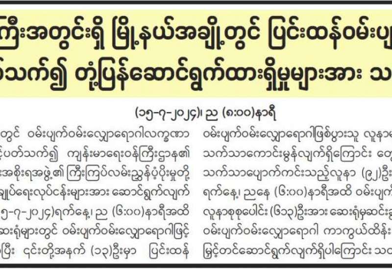 ၁။ ၂၀၂၄ ခုနှစ် ဇူလိုင်လ ၁၉ ရက်နေ့တွင် ကျင်းပပြုလုပ်မည့် (၇၇) နှစ်မြောက် အာဇာနည်နေ့အခမ်းအနားကို ဗဟန်းမြို့နယ်ရှိ အာဇာနည်ဗိမာန်တွင် ကျင်းပပြုလုပ်မည်ဖြစ်ရာ အခမ်းအနားကျင်းပမည့် နံနက် ၄ နာရီအချိန်မှ အခမ်းအနားပြီးဆုံးသည်အထိ အနောက်ရွှေဂုံတိုင်လမ်းအား ရေတာရှည်လမ်းဟောင်းမှလည်းကောင်း၊ ရွှေဂုံလမ်းအား ဓမ္မစေတီ-ရွှေဂုံလမ်းဆုံမှလည်းကောင်း၊ အာဇာနည်လမ်းအား အနောက်ရွှေဂုံတိုင်လမ်းမှ ဦးထောင်ဘိုလမ်းအထိလည်းကောင်း၊ ဦးဝိစာရလမ်းအား ဦးဝိစာရအဝိုင်းမှ ဦးဝိစာရ-ဓမ္မစေတီလမ်းဆုံအထိ လည်းကောင်း လမ်းပိတ်/လမ်းလွှဲ ဆောင်ရွက်သွားမည်ဖြစ်ပါသည်။
