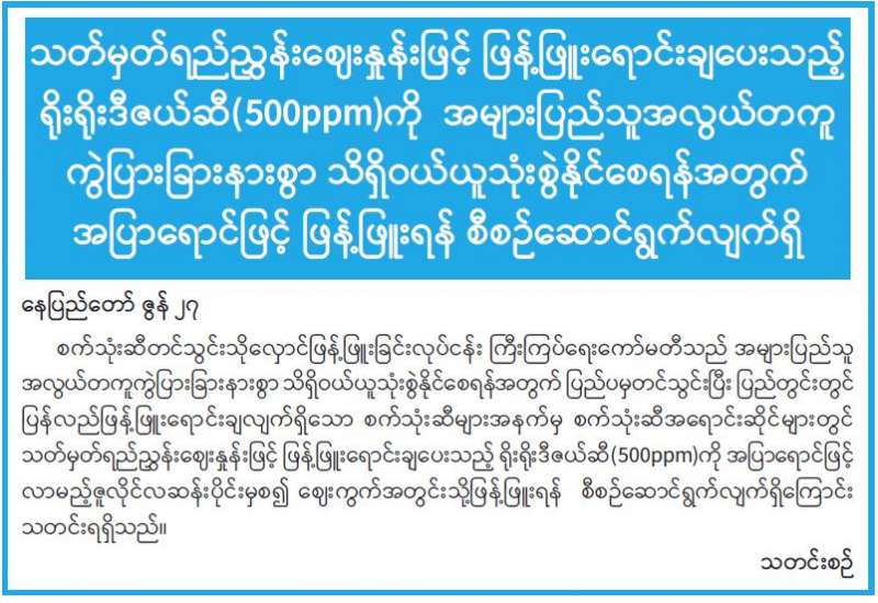 စက်သုံးဆီတင်သွင်းသိုလှောင်ဖြန့်ဖြူးခြင်းလုပ်ငန်း ကြီးကြပ်ရေးကော်မတီသည် အများပြည်သူ အလွယ်တကူကွဲပြားခြားနားစွာ သိရှိဝယ်ယူသုံးစွဲနိုင်စေရန်အတွက် ပြည်ပမှတင်သွင်းပြီး ပြည်တွင်းတွင် ပြန်လည်ဖြန့်ဖြူးရောင်းချလျက်ရှိသော စက်သုံးဆီများအနက်မှ စက်သုံးဆီအရောင်းဆိုင်များတွင် သတ်မှတ်ရည်ညွှန်းဈေးနှုန်းဖြင့် ဖြန့်ဖြူးရောင်းချပေးသည့် ရိုးရိုးဒီဇယ်ဆီ(500ppm)ကို အပြာရောင်ဖြင့် လာမည့်ဇူလိုင်လဆန်းပိုင်းမှစ၍ ဈေးကွက်အတွင်းသို့ဖြန့်ဖြူးရန် စီစဉ်ဆောင်ရွက်လျက်ရှိကြောင်း သတင်းရရှိသည်။