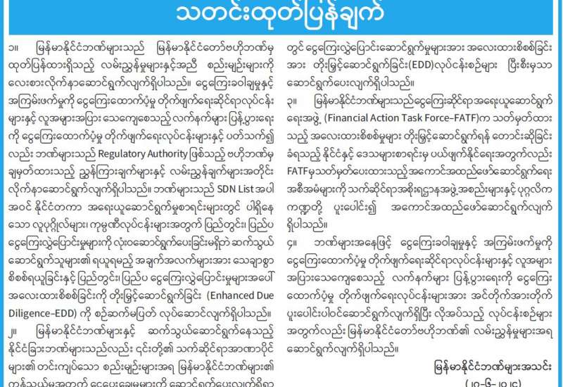၁။ မြန်မာနိုင်ငံဘဏ်များသည် မြန်မာနိုင်ငံတော်ဗဟိုဘဏ်မှ ထုတ်ပြန်ထားရှိသည့် လမ်းညွှန်မှုများနှင့်အညီ စည်းမျဉ်းများကို လေးစားလိုက်နာဆောင်ရွက်လျက်ရှိပါသည်။ ငွေကြေးခဝါချမှုနှင့်အကြမ်းဖက်မှုကို ငွေကြေးထောက်ပံ့မှု တိုက်ဖျက်ရေးဆိုင်ရာလုပ်ငန်းများနှင့် လူအများအပြား သေကျေစေသည့် လက်နက်များပြန့်ပွားရေးကို ငွေကြေးထောက်ပံ့မှု တိုက်ဖျက်ရေးလုပ်ငန်းများနှင့်ပတ်သက်၍လည်း ဘဏ်များသည် Regulatory Authority ဖြစ်သည့် ဗဟိုဘဏ်မှချမှတ်ထားသည့် ညွှန်ကြားချက်များနှင့် လမ်းညွှန်ချက်များအတိုင်း လိုက်နာဆောင်ရွက်လျက်ရှိပါသည်။