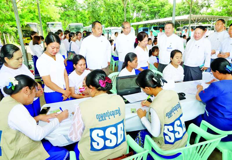 အလုပ်သမားဝန်ကြီးဌာန ပြည်ထောင်စုဝန်ကြီး ဦးမြင့်နောင်သည် ယနေ့နံနက်ပိုင်းတွင် လူမှုဖူလုံရေးအဖွဲ့ ရွေ့လျားဆေးကုသယာဉ်ဖြင့် နေပြည်တော်ကောင်စီရှိ လူမှုဖူလုံရေးအကျုံးဝင် အာမခံအလုပ်သမားများအား ဆေးဝါးကုသပေးမှု၊ ဓာတ်ခွဲစစ်ဆေးပေးမှုနှင့် နှလုံးအတွက် ECG စစ်ဆေးခြင်းများ ကွင်းဆင်းဆောင်ရွက်ပေးနေမှုကို ကြည့်ရှုအားပေးသည်။