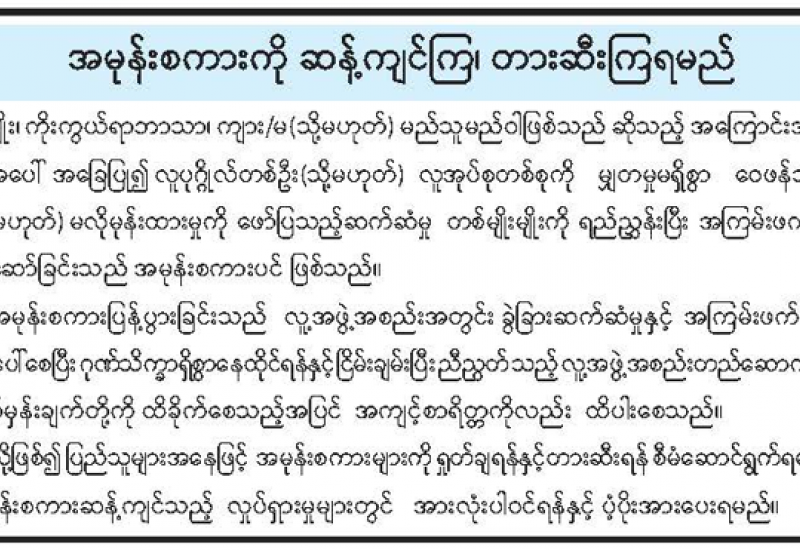 စာကြည့်တိုက်များဖွံ့ဖြိုးတိုးတက်ရေးနှင့် စာဖတ်ရှိန်မြှင့်တင်ရေးပွဲတော်ကို ပဲခူးတိုင်းဒေသကြီး၊ ပဲခူးမြို့၊ အမှတ်(၁)အခြေခံပညာအထက်တန်းကျောင်းတွင် ဇွန် ၂၂ ရက်နေ့မှ ၂၄ ရက်နေ့အထိ စာစီစာကုံးပြိုင်ပွဲ၊ ကျပန်စကားပြောပြိုင်ပွဲ၊ စာဖတ်စွမ်းရည်ပြိုင်ပွဲ၊ ပုံပြောပြိုင်ပွဲ၊ ကဗျာရွတ်ပြိုင်ပွဲနှင့် ဟောပြောပွဲများကို ကျင်းပပြုလုပ်ခဲ့ရာ စာကြည့်တိုက်များဖွံ့ဖြိုးတိုးတက်ရေးနှင့် စာဖတ်ရှိန်မြှင့်တင်ရေးပွဲတော်နှင့် ပတ်သက်၍ စာရေးဆရာများ၊ မြို့နယ်ပညာရေးမှူးနှင့် ပြိုင်ပွဲများတွင် ဆုရရှိသည့် ကျောင်းသား၊ ကျောင်းသူများ၏ ရင်တွင်းစကားသံများ ယခုလိုကြားသိရပါတယ်-