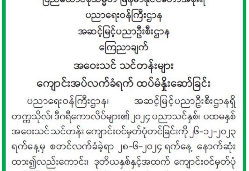 ပညာရေးဝန်ကြီးဌာန၊ အဆင့်မြင့်ပညာဦးစီးဌာနရှိ တက္ကသိုလ်၊ ဒီဂရီကောလိပ်များ၏ ၂၀၂၄ ပညာသင်နှစ်၊ ပထမနှစ် အဝေးသင်သင်တန်း ကျောင်းဝင်မှတ်ပုံတင်ခြင်းကို ၂၆-၁၂-၂ဝ၂၃ ရက်နေ့မှ စတင်လက်ခံခဲ့ရာ ၂၈-၆-၂ဝ၂၄ ရက်နေ့ နောက်ဆုံးထား၍လည်းကောင်း၊ ဒုတိယနှစ်နှင့်အထက် ကျောင်းဝင်မှတ်ပုံတင်ခြင်းကို ၅-၂-၂၀၂၄ ရက်နေ့မှ စတင်လက်ခံခဲ့ရာ ၂၈-၆-၂၀၂၄ ရက်နေ့ နောက်ဆုံးထား၍လည်းကောင်း သက်ဆိုင်ရာတက္ကသိုလ်နှင့် ဒီဂရီကောလိပ်များတွင် ဆောင်ရွက်ကြရန် ထပ်မံနှိုးဆော်လိုက်သည်။