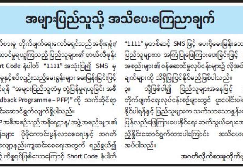၁။ အဂတိလိုက်စားမှု တိုက်ဖျက်ရေးကော်မရှင်သည် အစိုးရရုံး/ဌာနများတွင် ဝန်ဆောင်မှုရယူကြသည့် ပြည်သူများ၏ တယ်လီဖုန်းနံပါတ်များသို့ Short Code နံပါတ် “1111” အသုံးပြု၍ SMS မှတစ်ဆင့် ဝန်ဆောင်မှုနှင့်စပ်လျဉ်းသည့်မေးခွန်းများ မေးမြန်းခြင်းဖြင့် တုံ့ပြန်မှုများရယူနိုင်ရန် “အများပြည်သူထံမှ တုံ့ပြန်မှုရယူခြင်းအစီအစဉ် (Public Feedback Programme - PFP)” ကို သက်ဆိုင်ရာဌာနများနှင့် ပူးပေါင်းဆောင်ရွက်လျက်ရှိပါသည်။