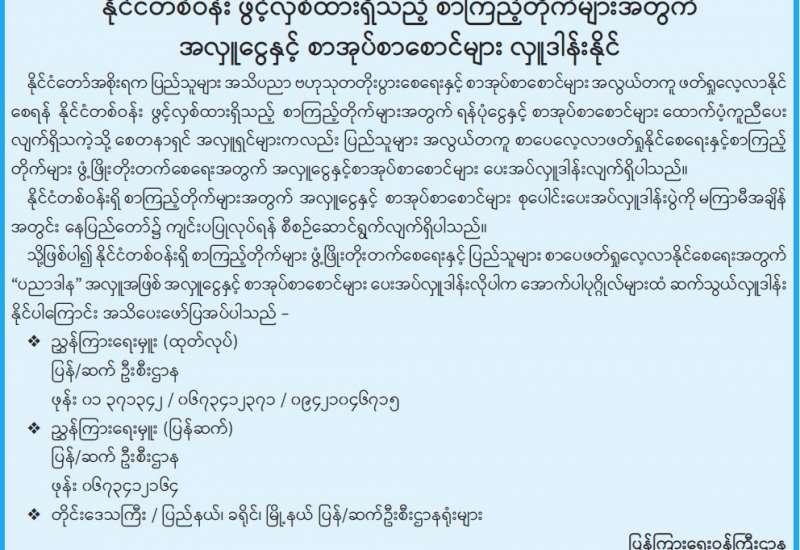 နိုင်ငံတော်အစိုးရက ပြည်သူများ အသိပညာဗဟုသုတတိုးပွားစေရေးနှင့် စာအုပ်စာစောင်များ အလွယ်တကူဖတ်ရှုလေ့လာနိုင်စေရန် နိုင်ငံတစ်ဝန်း ဖွင့်လှစ်ထားရှိသည့် စာကြည့်တိုက်များအတွက် ရန်ပုံငွေနှင့် စာအုပ်စာစောင်များ ထောက်ပံ့ကူညီပေးလျက်ရှိသကဲ့သို့ စေတနာရှင်အလှူရှင်များကလည်း ပြည်သူများ အလွယ်တကူ စာပေလေ့လာဖတ်ရှုနိုင်စေရေးနှင့် စာကြည့်တိုက်များ ဖွံ့ဖြိုးတိုးတက်စေရေးအတွက် အလှူငွေနှင့်စာအုပ်စာစောင်များ ပေးအပ်လှူဒါန်းလျက်ရှိပါသည်။