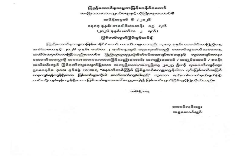 ပြည်ထောင်စုသမ္မတမြန်မာနိုင်ငံတော် ယာယီသမ္မတသည် ယနေ့တွင်ကျရောက်သည့် (၆၄) နှစ်မြောက် တောင်သူလယ်သမားနေ့အထိမ်းအမှတ်နေ့ကို ဂုဏ်ပြုသောအားဖြင့် ပြည်သူလူထုနှလုံးစိတ်ဝမ်းအေးချမ်းစေရန်နှင့် လူသားချင်းစာနာထောက်ထားမှုကို အလေးထားသောအားဖြင့် နိုင်ငံတော်၏မေတ္တာနှင့် စေတနာကိုနားလည်စေရန်ရှေးရှု၍ ၂ဝ၂၆ ခုနှစ်၊ မတ်လ ၂ ရက်နေ့မတိုင်မီ လူသတ်မှု၊ မုဒိမ်းမှု၊ ပေါက်ကွဲစေတတ်သော ဝတ္ထုပစ္စည်းများအက်ဥပဒေအရ ပြစ်မှုများ၊ မတရားအသင်းများအက်ဥပဒေအရ ပြစ်မှုများ၊ ၁၈၇၈ ခုနှစ် လက်နက်များအက်ဥပဒေပုဒ်မ ၁၉(စ)အရ ပြစ်မှုများ၊ ၁၉၄၉ ခုနှစ် လက်နက်(အရေးပေါ် ပြစ်ဒဏ်စီရင်မှု) (ယာယီ) အက်ဥပဒေအရပြစ်မှုများ၊ ၁၉၅၁ ခုနှစ် လက်နက်(ယာယီပြင်ဆင်ချက်) အက်ဥပဒေအရပြစ်မှုများ၊ ၁၉၂၄ ခုနှစ် ရှမ်းပြည်နယ်လက်နက်အမိန့်အရ ပြစ်မှုများ၊ ၂ဝ၂၃ ခုနှစ်၊ လက်နက်ဥပဒေအရ ပြစ်မှုများ၊ မူးယစ်ဆေးဝါးနှင့် စိတ်ကိုပြောင်းလဲစေတတ်သော ဆေးဝါးများဆိုင်ရာဥပဒေအရပြစ်မှုများ၊ သဘာဝဘေးအန္တရာယ်ဆိုင်ရာစီမံခန့်ခွဲမှုဥပဒေအရပြစ်မှုများ၊ အကြမ်းဖက်မှုတိုက်ဖျက်ရေး ဥပဒေအရပြစ်မှုများနှင့် အဂတိလိုက်စားမှုတိုက်ဖျက်ရေးဥပဒေအရ ပြစ်မှုများမှအပ တည်ဆဲဥပဒေတစ်ရပ်ရပ်အရ ပြစ်မှုတစ်ခုခုနှင့်စပ်လျဉ်း၍ ပြစ်ဒဏ်ချမှတ်ခြင်းခံရပြီး အကျဉ်းထောင်/ အချုပ်ထောင်/ စခန်းအသီးသီးတွင် ပြစ်ဒဏ်ကျခံလျက်ရှိသော အကျဉ်းသား/အကျဉ်းသူများကို ရာဇဝတ်ကျင့်ထုံးဥပဒေပုဒ်မ ၄၀၁၊ ပုဒ်မခွဲ(၁) အရ ယင်းတို့ကျခံရန် ကျန်ရှိသောပြစ်ဒဏ်၏ ခြောက်ပုံတစ်ပုံကို လွတ်ငြိမ်းသက်သာခွင့်အားလည်းကောင်း၊ နိုင်ငံတစ်ဝန်းရှိ အကျဉ်းထောင်/ အချုပ်ထောင်/ စခန်းအသီးသီးတွင် ပြစ်ဒဏ်ကျခံလျက်ရှိသော အကျဉ်းသား/ အကျဉ်းသူ ၂၈၂၅ ဦးကို ရာဇဝတ်ကျင့်ထုံးဥပဒေပုဒ်မ ၄၀၁၊ ပုဒ်မခွဲ(၁)အရ “နောက်တစ်ကြိမ် ပြစ်မှုထပ်မံကျူးလွန်ပါက ၎င်းပြစ်ဒဏ်အပြင် ယခုကျခံရန် ကျန်ရှိသော ပြစ်ဒဏ်များကိုပါ ဆက်လက်ကျခံပါမည်" ဟူသော စည်းကမ်းသတ်မှတ်ချက်ဖြင့် ယင်းတို့ကျခံရန်ကျန်ရှိသော ပြစ်ဒဏ်များအပေါ် လျှော့ပေါ့၍ ပြစ်ဒဏ်လွတ်ငြိမ်းခွင့်အားလည်းကောင်း ခွင့်ပြုခဲ့သည်။