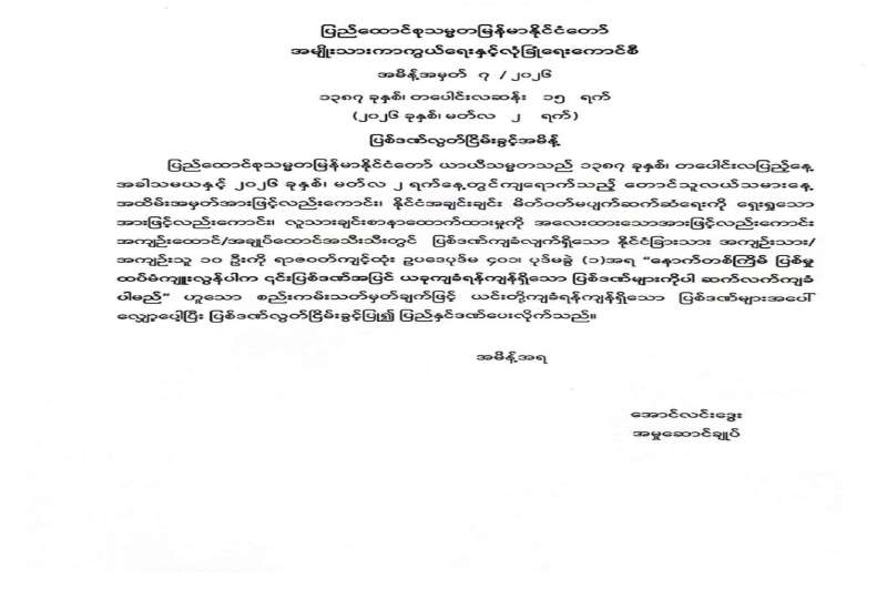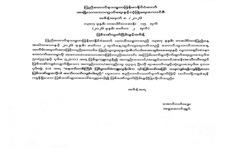 ပြည်ထောင်စုသမ္မတမြန်မာနိုင်ငံတော် ယာယီသမ္မတသည် ၁၃၈၇ ခုနှစ်၊ တပေါင်းလပြည့်နေ့ အခါသမယနှင့် ၂၀၂၆ ခုနှစ်၊ မတ်လ ၂ ရက်နေ့တွင် ကျရောက်သည့် တောင်သူလယ်သမားနေ့ အထိမ်းအမှတ်အားဖြင့်လည်းကောင်း၊ ပြည်သူလူထု နှလုံးစိတ်ဝမ်းအေးချမ်းစေရေးနှင့် လူသားချင်းစာနာထောက်ထားမှုကို အလေးထားသောအားဖြင့်လည်းကောင်း၊ နိုင်ငံတော်၏မေတ္တာနှင့်စေတနာကိုနားလည်စေရန် ရှေးရှုသောအားဖြင့်လည်းကောင်း အမျိုးသားကာကွယ်ရေးနှင့် လုံခြုံရေးကောင်စီအမိန့်များထုတ်ပြန်ကာ ပြစ်ဒဏ်လွတ်ငြိမ်းသက်သာခွင့်၊ ပြစ်ဒဏ်လွတ်ငြိမ်းခွင့်များနှင့် အကြမ်းဖက်မှုတိုက်ဖျက်ရေးဥပဒေပုဒ်မ ၅၀ (ည)၊ ပုဒ်မ ၅၂ (က)ဖြင့် ကြားနာစစ်ဆေးဆဲအမှုများကို ပိတ်သိမ်းလိုက်သည်။