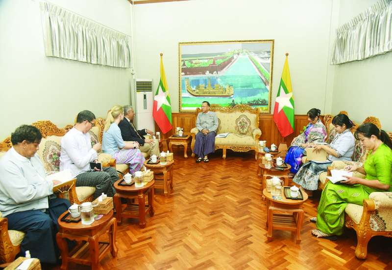 ရင်းနှီးမြှုပ်နှံမှုနှင့် နိုင်ငံခြားစီးပွားဆက်သွယ်ရေးဝန်ကြီးဌာန ပြည်ထောင်စုဝန်ကြီးဒေါက်တာကံဇော်သည် ထိုင်းနိုင်ငံဗန်ကောက်မြို့ အခြေစိုက်ကုလသမဂ္ဂစီမံကိန်းဝန်ဆောင်မှုရုံး (UNOPS) ၏ အာရှဒေသဆိုင်ရာ ညွှန်ကြားရေးမှူးမစ္စတာဆန်ဂျေးမာသာနှင့်အဖွဲ့ကို ယနေ့နံနက်ပိုင်းတွင် နေပြည်တော်ရှိရင်းနှီးမြှုပ်နှံမှုနှင့် နိုင်ငံခြားစီးပွား ဆက်သွယ်ရေးဝန်ကြီးဌာန ရုံးအမှတ်(၁)၌ လက်ခံတွေ့ဆုံသည်။