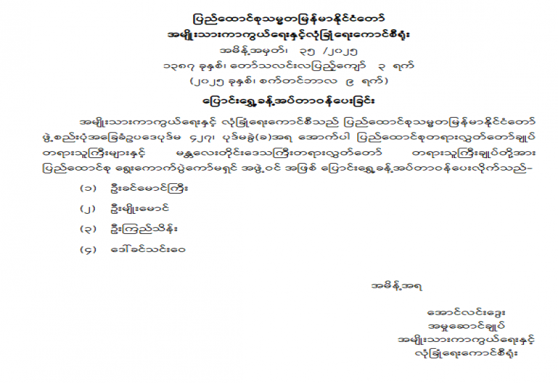 ၂၀၂၅-၂၀၂၆ ဘဏ္ဍာနှစ်အတွက် ပြည်ထောင်စုနယ်မြေ နေပြည်တော်အတွင်းရှိ အသက် ၈၅ နှစ်နှင့် အထက် သက်ကြီးပုဂ္ဂိုလ်များအား လူမှုရေးပင်စင်ထောက်ပံ့ခြင်း၊ စေတနာ့ဝန် ထမ်းအဖွဲ့အစည်းများနှင့် တိုက်ပွဲရှောင်ပြည်သူများအတွက် ထောက်ပံ့ကြေး ပေးအပ်ခြင်းအခမ်းအနားကို ယနေ့မွန်းလွဲပိုင်းတွင် ပျဉ်းမနားမြို့ မင်္ဂလာဗျူဟာခန်းမ၌ကျင်းပရာ လူမှုဝန်ထမ်း၊ ကယ်ဆယ်ရေးနှင့်ပြန်လည်နေရာချထား ရေးဝန်ကြီးဌာန ပြည်ထောင်စုဝန်ကြီး ဒေါက်တာ စိုးဝင်း၊ ဒုတိယဝန်ကြီးဒေါက်တာသန်းစိုး၊ နေပြည်တော်ကောင်စီဝင်များ၊ ဌာနဆိုင်ရာတာဝန်ရှိသူများနှင့် စေတနာ့ဝန်ထမ်းအဖွဲ့အစည်းများမှ ကိုယ်စားလှယ်များ တက်ရောက်ကြသည်။