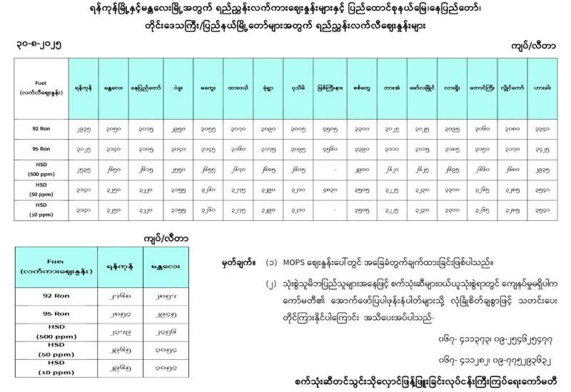 ရန်ကုန်မြို့နှင့် မန္တလေးမြို့အတွက် ရည်ညွှန်းလက်ကားဈေးနှုန်းများနှင့် ပြည်ထောင်စုနယ်မြေ နေပြည်တော်၊ တိုင်းဒေသကြီး/ပြည်နယ် မြို့တော်များအတွက် ရည်ညွှန်းလက်လီဈေးနှုန်းများ