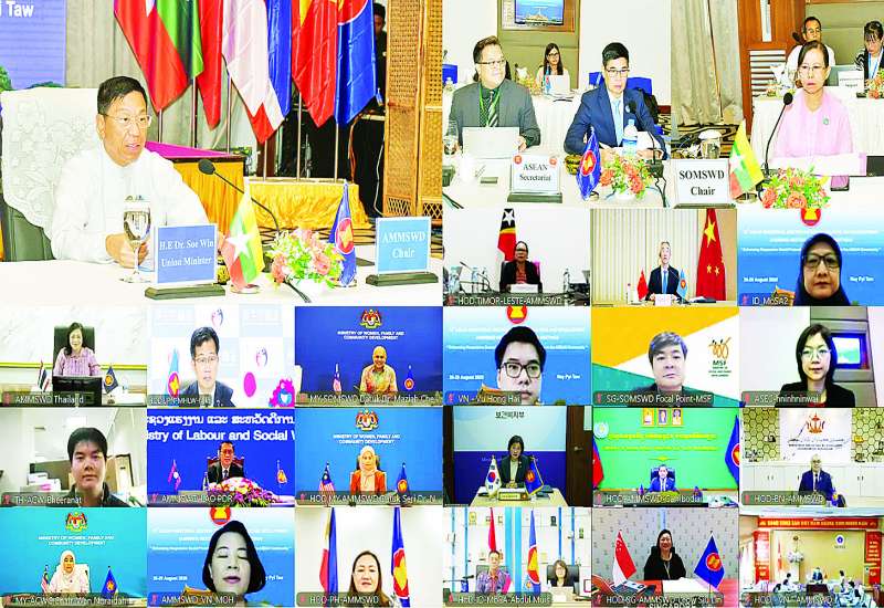 မြန်မာနိုင်ငံက အိမ်ရှင်နိုင်ငံအဖြစ် (၁၂) ကြိမ်မြောက် အာဆီယံလူမှုဝန်ထမ်းနှင့် ဖွံ့ဖြိုးတိုးတက်ရေးဆိုင်ရာ ဝန်ကြီးများအဆင့် အစည်းအဝေး (12th ASEAN Ministerial Meeting on Social Welfare and Development- AMMSWD)နှင့် (၈)ကြိမ်မြောက် အာဆီယံ+၃ လူမှုဝန်ထမ်းနှင့် ဖွံ့ဖြိုးတိုးတက်ရေးဆိုင်ရာ ဝန်ကြီးများအဆင့်အစည်းအဝေး (8th ASEAN+3 Ministerial Meeting on Social Welfare and Development- AMMSWD+3) များကို ယနေ့နံနက်ပိုင်းတွင် နေပြည်တော်ရှိ M-Gallery Hotel ၌ Video Conference ဖြင့်ကျင်းပရာ အာဆီယံလူမှုဝန်ထမ်းနှင့် ဖွံ့ဖြိုးတိုးတက်ရေးဆိုင်ရာ ဝန်ကြီးများ အဆင့်အစည်းအဝေး အလှည့်ကျဥက္ကဋ္ဌဖြစ်သော လူမှုဝန်ထမ်း၊ ကယ်ဆယ်ရေးနှင့်ပြန်လည်နေရာ ချထားရေးဝန်ကြီးဌာန ပြည်ထောင်စုဝန်ကြီး ဒေါက်တာစိုးဝင်းက ဥက္ကဋ္ဌအဖြစ် ဆောင်ရွက်သည်။