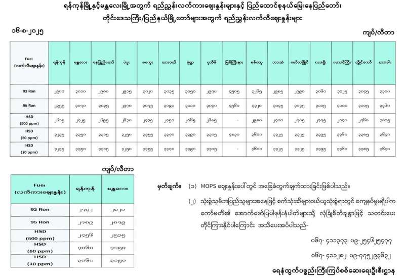 ရန်ကုန်မြို့နှင့် မန္တလေးမြို့အတွက် ရည်ညွှန်းလက်ကားဈေးနှုန်းများနှင့် ပြည်ထောင်စုနယ်မြေ နေပြည်တော်၊ တိုင်းဒေသကြီး/ပြည်နယ် မြို့တော်များအတွက် ရည်ညွှန်းလက်လီဈေးနှုန်းများ