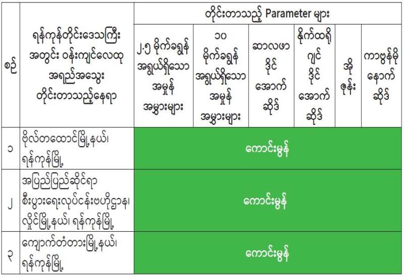 ရန်ကုန်တိုင်းဒေသကြီး၊ ပတ်ဝန်းကျင်ထိန်းသိမ်းရေးဦးစီးဌာနအနေဖြင့် ရန်ကုန်မြို့အတွင်း အောက်ဖော် ပြပါ တိုင်းတာမှတ်(၃)နေရာတွင် Ambient Air Quality Monitoring Station with Mobile Car-(AQMS Mobile Car)၊ Compact Air Quality Monitoring Station- (AQM 65) စက်များကိုအသုံးပြု၍ Particulate Matter 2.5 (PM2.5)၊ Particulate Matter 10 (PM10)၊ Sulphur Dioxide (SO2)၊ Nitrogen Dioxide (NO2)၊ Ozone (O3) နှင့် Carbon Monoxide (CO) စသည့် အဓိက Parameter (၆)မျိုးကို ၂၄ နာရီ ပုံမှန် တိုင်းတာပြီး လေ့လာဆန်းစစ်လျက်ရှိပါသည်။