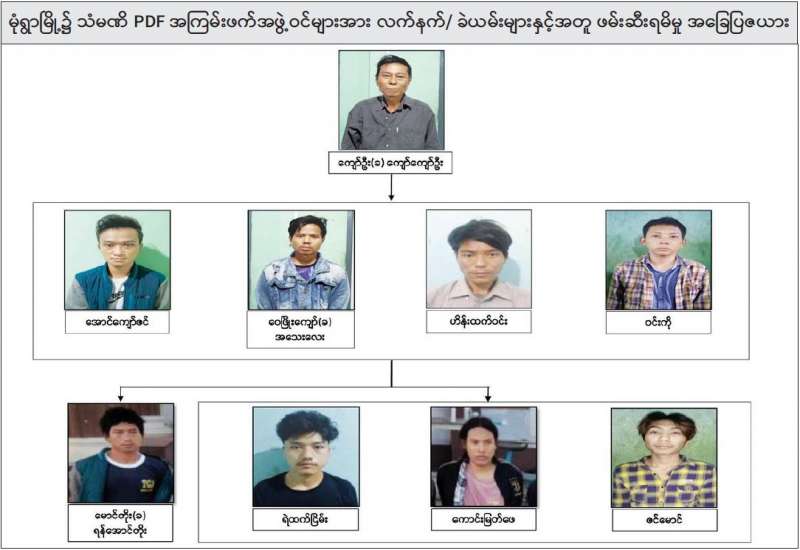 NUG အမည်ခံအကြမ်းဖက်အဖွဲ့၏ စေခိုင်းချက်အရ စက်ရုံ၊ အလုပ်ရုံများအား ဖောက်ခွဲဖျက်ဆီးခြင်းနှင့် အပြစ်မဲ့ပြည်သူများအား ပစ်မှတ်ထား၍ သတ်ဖြတ်ခြင်းတို့အား ဆောင်ရွက်မှုမရှိစေရေး ဖော်ထုတ်ဖမ်းဆီးမှုများ ဆောင်ရွက်လျက်ရှိရာ ၂၀၂၁ ခုနှစ်၊ နိုဝင်ဘာလ ၁၇ ရက်တွင် မုံရွာ သံမဏိ PDF အမည်ခံအကြမ်းဖက်အဖွဲ့နှင့် ပတ်သက် ဆက်သွယ်နေသော မုံရွာမြို့၊ အောင်ချမ်းသာရပ်ကွက်နေ ကျော်ဦး(ခ) ကျော်ကျော်ဦး (၄၇)နှစ်အား ဖမ်းဆီးရမိခဲ့ပြီး ၎င်း၏ ထွက်ဆိုချက်အရ နိုဝင်ဘာလ ၁၈ ရက်တွင် ချမ်းမြဝတီ ရပ်ကွက်၊ "အားသစ်" တည်းခိုခန်း၊ အခန်းအမှတ်(၃၀၁)၌ အောင်ကျော်ဇင် (၂၇)နှစ်၊ ဝေဖြိုးကျော်(ခ)အသေးလေး (၂၅)နှစ်၊ ဟိန်းထက်ဝင်း (၂၀)နှစ်နှင့် ဝင်းကို(၁၉)နှစ်တို့ ၄ ဦးအား ဖမ်းဆီးရမိခဲ့သည်။