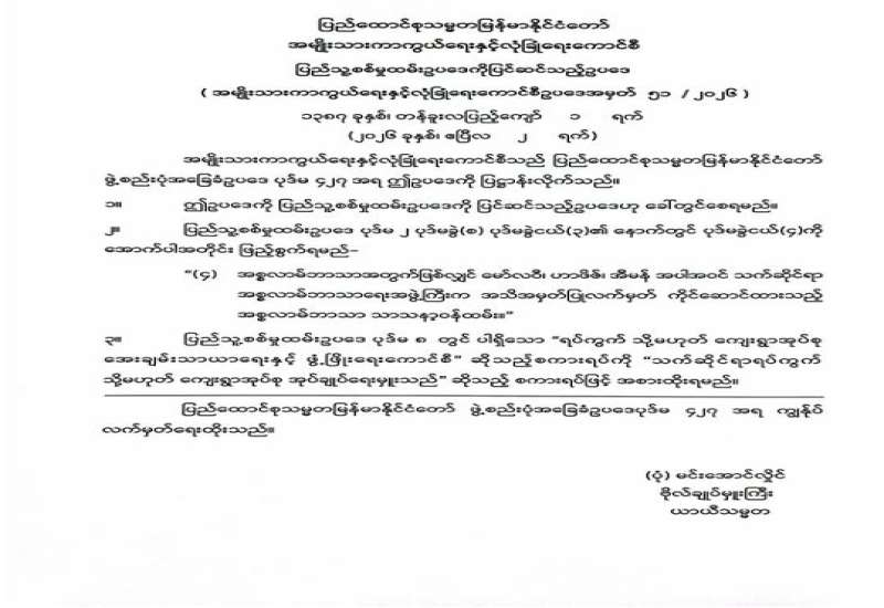 ၁။ နိုင်ငံတော်၏ စီးပွားရေးဖွံ့ဖြိုးတိုးတက်မှုအတွက် အဓိကအခြေခံအုတ်မြစ်ဖြစ်သည့် စိုက်ပျိုးရေးကဏ္ဍ စဉ်ဆက်မပြတ် ဖွံ့ဖြိုးတိုးတက်စေရန်နှင့် တောင်သူလယ်သမားများ၏ ကုန်ထုတ်လုပ်မှုစရိတ်များ လျော့ကျစေရန်အတွက် ဓာတ်မြေဩဇာများ တင်သွင်းမှုအပေါ်ကောက်ခံသည့် ကြိုတင်ဝင်ငွေခွန် ၂ ရာခိုင်နှုန်းကို ၁-၄-၂၀၂၆ ရက်နေ့မှ ၃၀-၄-၂၀၂၆ ရက်နေ့အထိ ကင်းလွတ်ခွင့်ပြုမည်ဖြစ်ကြောင်း အသိပေးကြေညာအပ်ပါသည်။