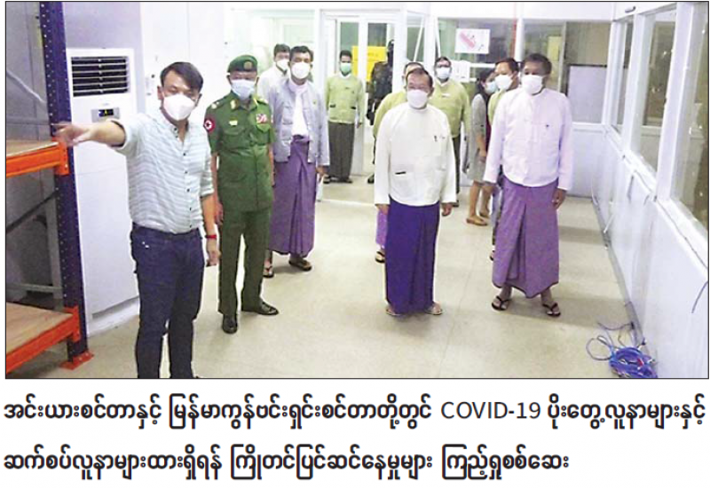 ရန်ကုန်တိုင်းဒေသကြီး မရမ်းကုန်း မြို့နယ်ရှိ အင်းယားစင်တာနှင့် မင်းဓမ္မလမ်းပေါ်ရှိ မြန်မာကွန်ဗင်း ရှင်းစင်တာ(MCC)တို့၌ COVD-19 ပိုးတွေ့လူနာများ ထားရှိရေး ကြိုတင် ပြင်ဆင်နေမှုများကို ယနေ့နံနက်ပိုင်းတွင် ရန်ကုန် တိုင်းဒေသကြီး စီမံအုပ်ချုပ်ရေးကောင်စီဥက္ကဋ္ဌ ဦးလှစိုး၊ ရန်ကုန် တိုင်းစစ်ဌာနချုပ် တိုင်းမှူး ဗိုလ်ချုပ် ညွန့်ဝင်းဆွေနှင့်တာဝန် ရှိသူများက သွားရောက်ကြည့်ရှု ကြသည်။