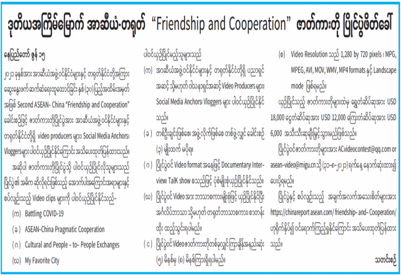 နိုင်ငံတော်စီမံအုပ်ချုပ်ရေးကောင်စီအဖွဲ့ဝင်၊ ကာကွယ်ရေးဝန်ကြီးဌာန၊ ပြည်ထောင်စု ဝန်ကြီး ဗိုလ်ချုပ်ကြီး မြထွန်းဦး ဦးဆောင်၍ နိုင်ငံတကာနှင့် ပြည်တွင်းရေးရာဦးစီးဌာန၊ ညွှန်ကြားရေးမှူးချုပ် ဗိုလ်မှူးကြီး ငြိမ်းချမ်းနှင့် တာဝန်ရှိသူများသည် ယနေ့တွင် အာဆီယံ အလှည့်ကျဥက္ကဋ္ဌ ဘရူနိုင်းဒါရူဆလာမ်နိုင်ငံက ဦးစီးကျင်းပသည့် (၈) ကြိမ်မြောက် အာဆီယံ အပေါင်း ကာကွယ်ရေးဝန်ကြီးများ အစည်းအဝေးသို့ ဗွီဒီယိုကွန်ဖရင့်စနစ်ဖြင့် ကာကွယ်ရေး ဝန်ကြီးဌာန ဝန်ကြီးရုံး အစည်းအဝေးခန်းမမှ ပါဝင်တက်ရောက်သည်။