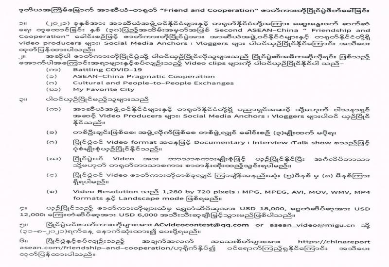 ဒုတိယအကြိမ်မြောက် အာဆီယံ-တရုတ် “Friend and Cooperation” ဇာတ်ကားတိုပြိုင်ပွဲဖိတ်ခေါ် ခြင်း