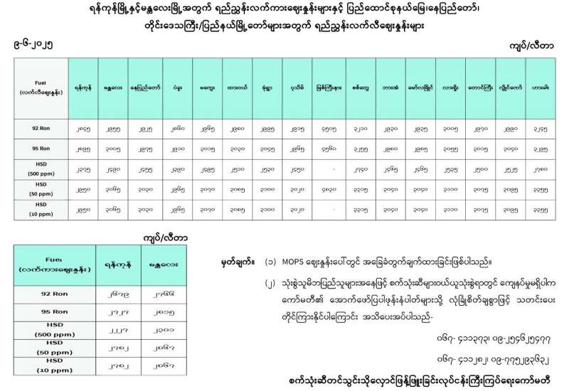 ရန်ကုန်မြို့နှင့် မန္တလေးမြို့အတွက် ရည်ညွှန်းလက်ကားဈေးနှုန်းများနှင့် ပြည်ထောင်စုနယ်မြေ နေပြည်တော်၊ တိုင်းဒေသကြီး/ပြည်နယ် မြို့တော်များအတွက် ရည်ညွှန်းလက်လီဈေးနှုန်းများ