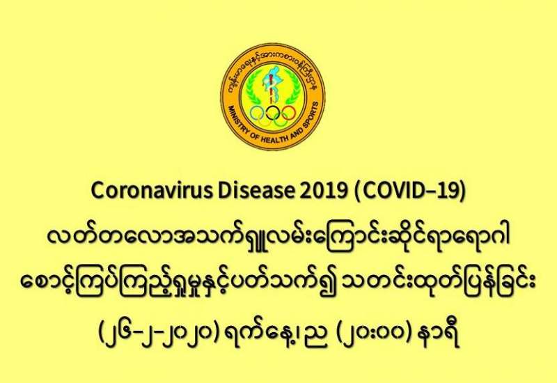 Coronavirus Disease 2019 (COVID-19) လတ်တလောအသက်ရှူလမ်းကြောင်းဆိုင်ရာရောဂါ စောင့်ကြပ်ကြည့်ရှုမှုနှင့် ပတ်သက်၍ သတင်းထုတ်ပြန်ခြင်း(၂၆-၂-၂၀၂၀ ရက်နေ့၊ ည (၈:၁၅) နာရီ)
