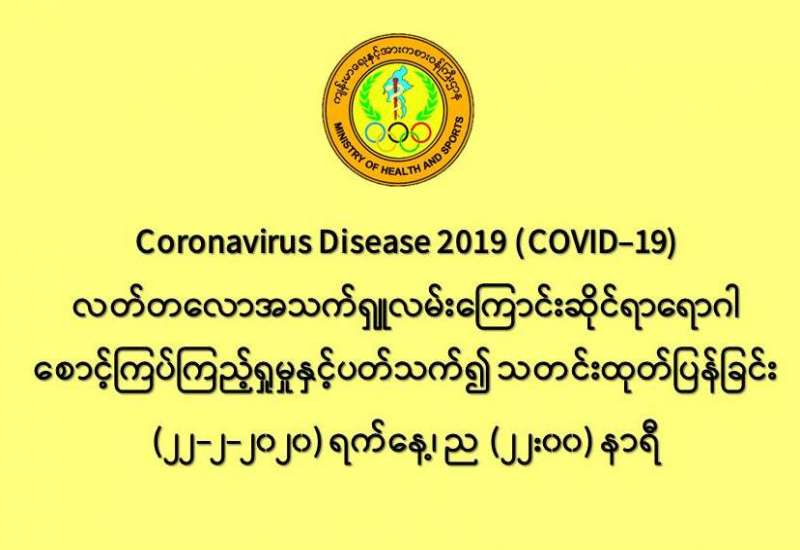 ၁။ ကျန်းမာရေးနှင့်အားကစားဝန်ကြီးဌာနသည် တရုတ်ပြည်သူ့သမ္မတနိုင်ငံနှင့် ကမ္ဘာ့နိုင်ငံအချို့တွင် ကူးစက်ပျံ့နှံ့လျက်ရှိသည့် COVID-19 လတ်တလော အသက်ရှူလမ်းကြောင်းဆိုင်ရာ ရောဂါ ဖြစ်ပွားမှုဖြစ်စဉ်နှင့် ပတ်သက်၍ ရောဂါစောင့်ကြပ်ကြည့်ရှုခြင်း လုပ်ငန်းများအား အပြည်ပြည် ဆိုင်ရာ ဝင်ပေါက်၊ ထွက်ပေါက်ဂိတ်များတွင်လည်းကောင်း၊ ဆေးရုံအခြေပြု အဖြစ်လည်းကောင်း၊ ပြည်သူလူထုအခြေပြု စောင့်ကြပ်ကြည့်ရှုခြင်း လုပ်ငန်းများဖြင့်လည်းကောင်း၊ ပုဂ္ဂလိက ဆေးရုံ များနှင့် ပူးပေါင်း၍လည်းကောင်း ဆောင်ရွက်လျက်ရှိပါသည်။