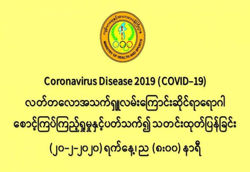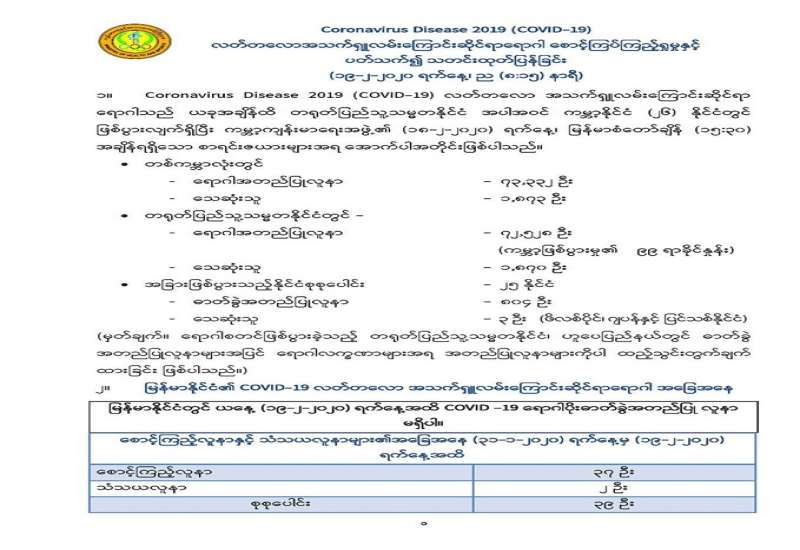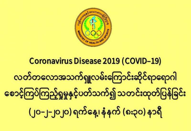 က။ ကျန်းမာရေးနှင့်အားကစားဝန်ကြီးဌာနသည် Coronavirus Disease 2019 (COVID-19) လတ်တလောအသက်ရှု လမ်းကြောင်းဆိုင်ရာရောဂါ စောင့်ကြပ်ကြည့်ရှမှုနှင့် ကာကွယ်ထိန်းချုပ်ရေး လုပ်ငန်းများကို အရှိန်အဟုန်ဖြင့် ဆောင်ရွက် လျက်ရှိရာ ယနေ့ (၂၀-၂-၂၀၂၀) ရက်နေ့၊ နံနက်အထိ စောင့်ကြည့်လူနာ (၁၁) ဦး တို့အား ဆေးရုံများတွင် ဆက်လက်၍ စောင့်ကြပ်ကြည့်ရှု ကုသမှုပေးခဲ့ပါသည်။