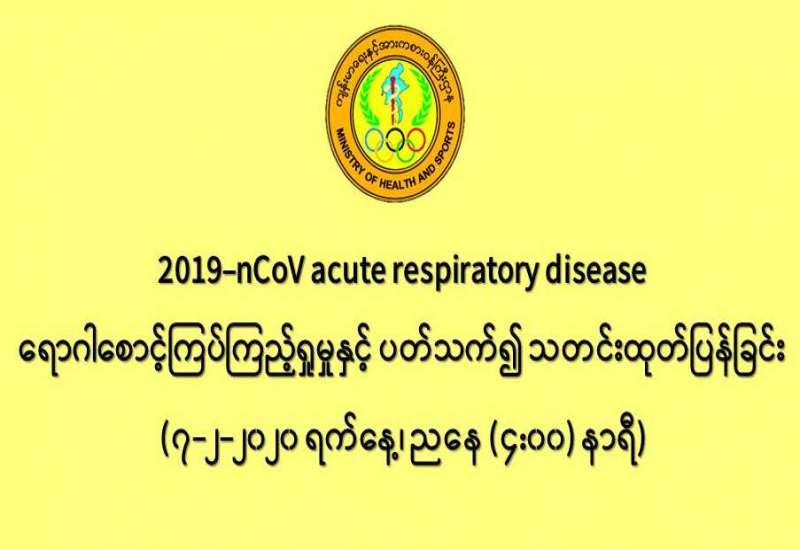 ကိုရိုနာဗိုင်းရပ်စ် (အဆုတ်ရောင်ရောဂါ) စောင့်ကြပ်ကြည့်ရှုမှုနှင့် စပ်လျဉ်း၍ ကျန်းမာရေးနှင့် အားကစားဝန်ကြီးဌာန၏ အင်တာနက်စာမျက်နှာ (WWW. mohs.gov.mm) က အချိန်နှင့်တစ်ပြေးညီ သတင်းထုတ်ပြန် ပေးလျက်ရှိသည်။ ဖေဖော်ဝါရီလ ၆ ရက် ညနေ ၆ နာရီအချိန်ထိ ထုတ်ပြန်ချက်အရ မြန်မာတစ်နိုင်ငံလုံးတွင် ကိုရိုနာဗိုင်းရပ်စ် (အဆုတ်ရောင်ရောဂါ) သံသယလူ နှစ်ဦးအပါအဝင် လူနာခုနစ်ဦးတို့အား သက်ဆိုင်ရာ ဆေးရုံများတွင် ဆက်လက်စောင့်ကြပ်ကြည့်ရှု ကုသပေးလျက်ရှိပြီး ၎င်းတို့၏ ကျန်းမာရေး အခြေအနေများ သက်သာကောင်းမွန်လျက်ရှိကြောင်း အဆိုပါ အင်တာနက် စာမျက်နှာတွင် တွေ့ရှိရသည်။